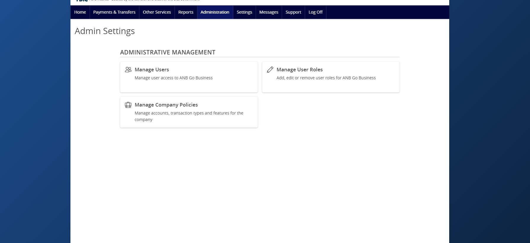 - American National Bank sets the account access for the Company Policy. These settings are for viewing purposes only and cannot be edited.